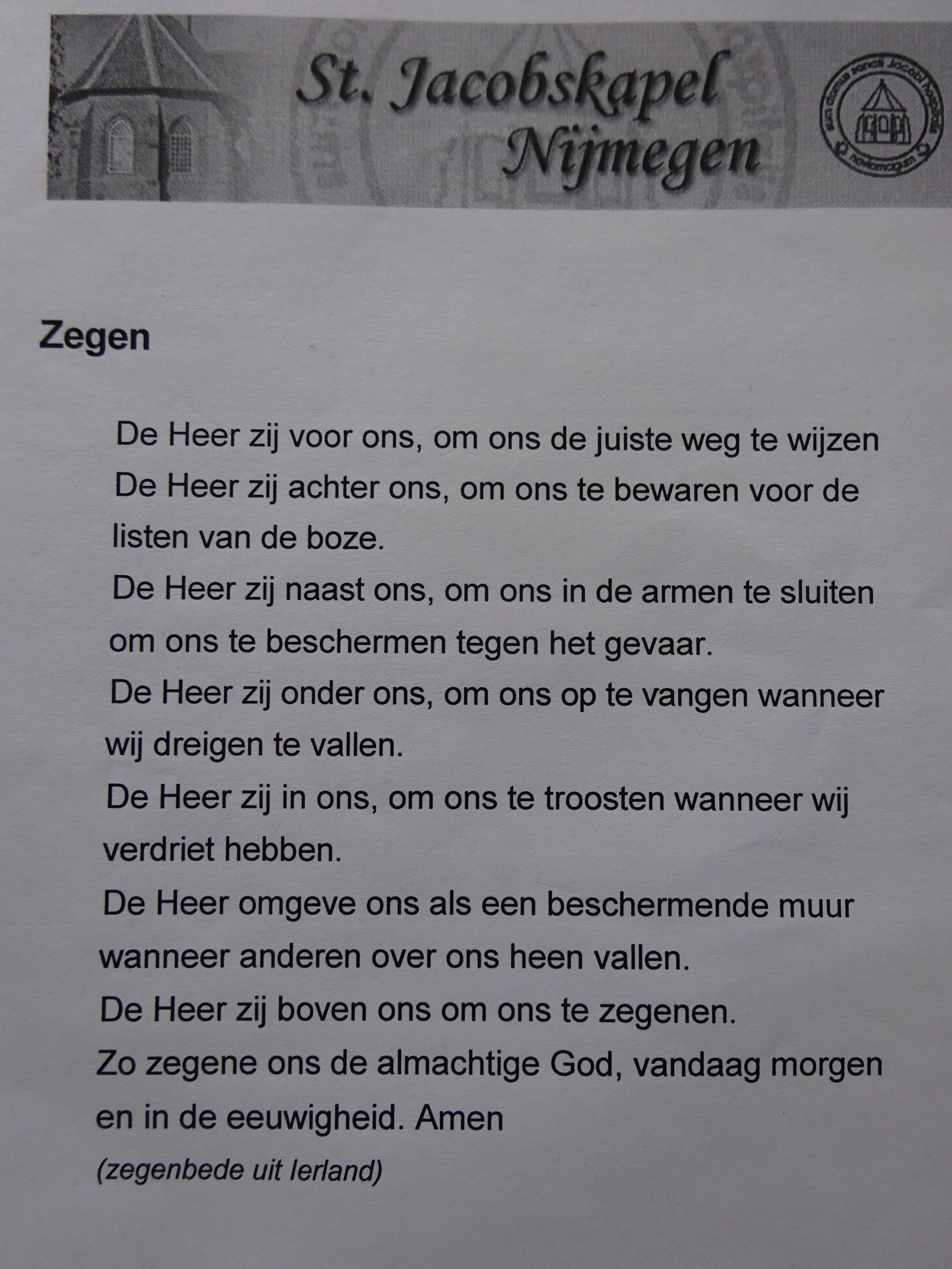 Na de Mis worden de aanwezige pelgrims (Maarte en ik dus) gezegend. Dus -schrik- staan we opeens samen voor het altaar. Er wordt een Ierse zegenbede (zie foto) voor ons uitgesproken. Dit hadden we van tevoren niet voorzien. Maar het is wel mooi. Daarna de tweede stempel op onze pelgrimspas.