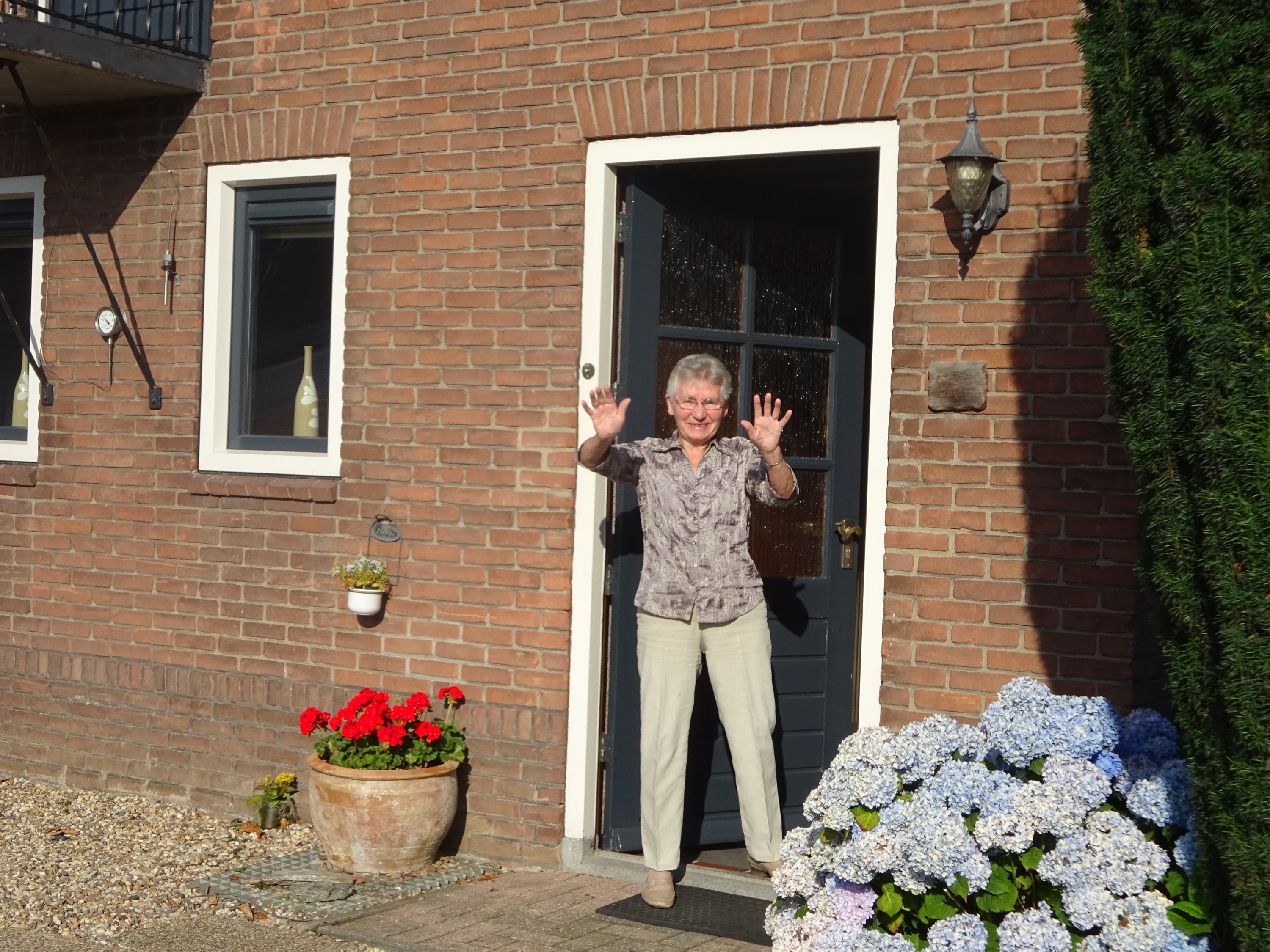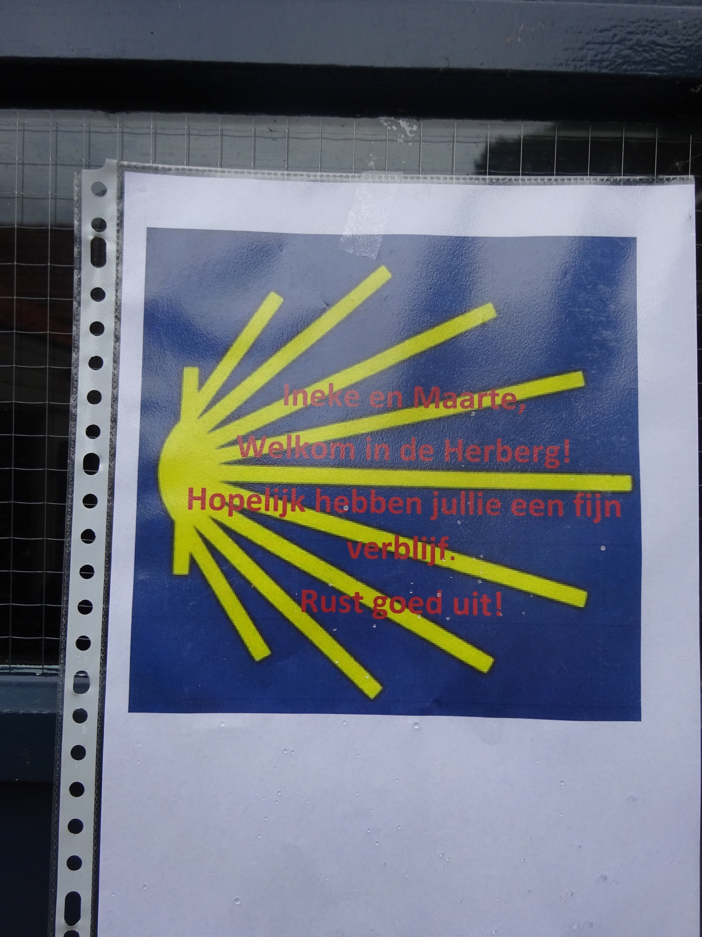Wij gaan verder over het Pieterpad naar Smakt. Daar verlaten we het pad en nemen de kortste route naar Venray. Het is al half zes als we bij Riet en André aankomen. Een lange wandeldag! Er hangt een pelgrims-welkom op de achterdeur😀.