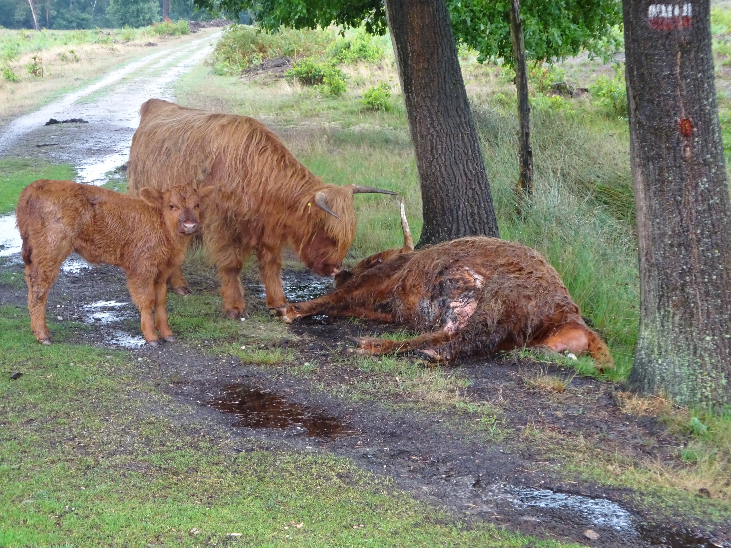 Als we om kwart voor negen vertrekken, is het inderdaad fantastisch wandelweer. We lopen het Reichswald in (de enige kilometer Duitsland op onze route). Er hangt de heerlijke frisheid van de ochtend. Wat een vooruitzicht om zo maanden te mogen wandelen! Na een steil glibberig hellinkje omlaag, zijn we weer terug in Nederland. We lopen langs de rand van het bos, richting Ottersum. En als we wat later in Gennep zijn is daar wel een erg aanlokkelijk terrasje, voor een kop koffie. Vanuit Gennep richting Afferden, eerst door bos, later door een prachtig mooi heidegebied. Moeite waard om later nog eens naar terug te gaan. We zien, in het natuurgebied een koe, waar we in eerste instantie van denken dat ze dood is. Er steekt een stuk kalf achteruit. Maar plots maakt ze toch weer allerlei bewegingen. Het kalfje beweegt niet. Het ziet er slecht uit. Denk niet dat dit goed is afgelopen…