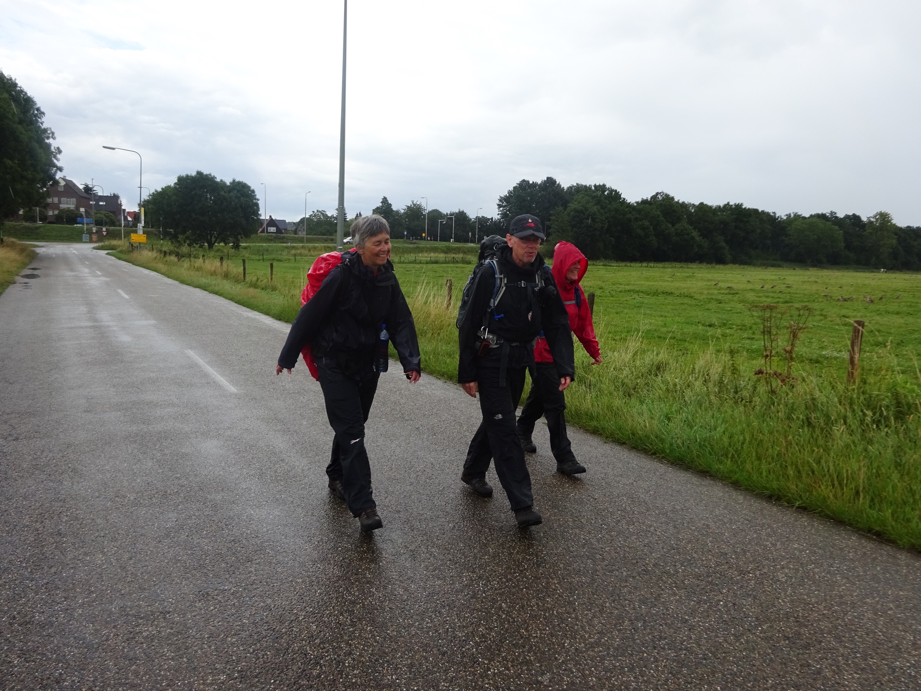 Vlak voor Afferden valt de regen opeens met bakken uit de hemel; onze hele regenuitrusting ( broek, jas, rugzakjes) moet er aan te pas komen.