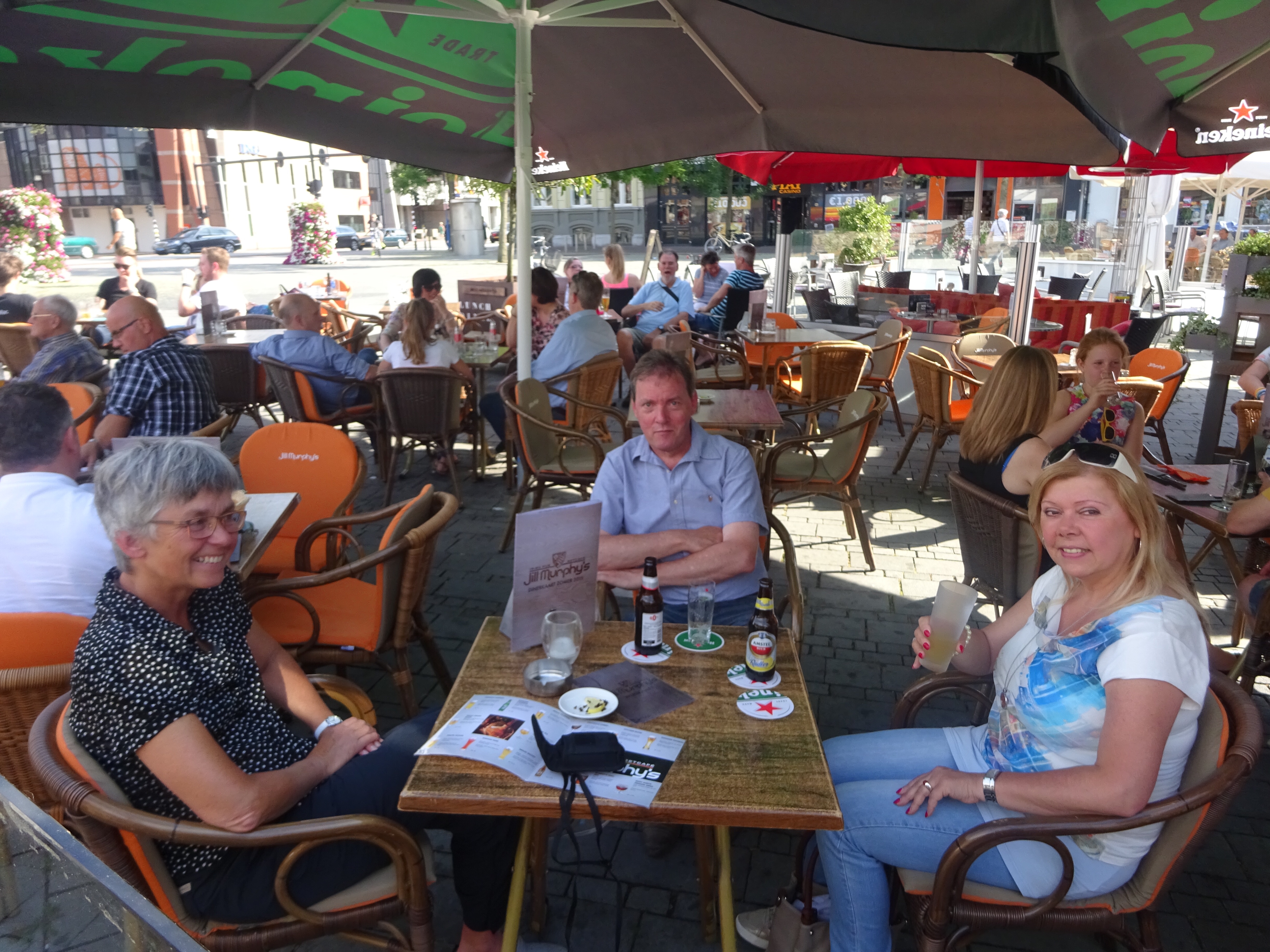 Na een douche zijn we weer behoorlijk opgeknapt. We gaan een biertje drinken. En als we dan het hotel uitlopen, zitten Jan en Susan hier op het terras. Verrassing! (Jan had vanochtend wat op en neer ge-appt met Maarte, en wist dus waar ons hotel is). We drinken samen wat. En later gaan we op de markt wat eten. Alweer een hele gezellige avond!