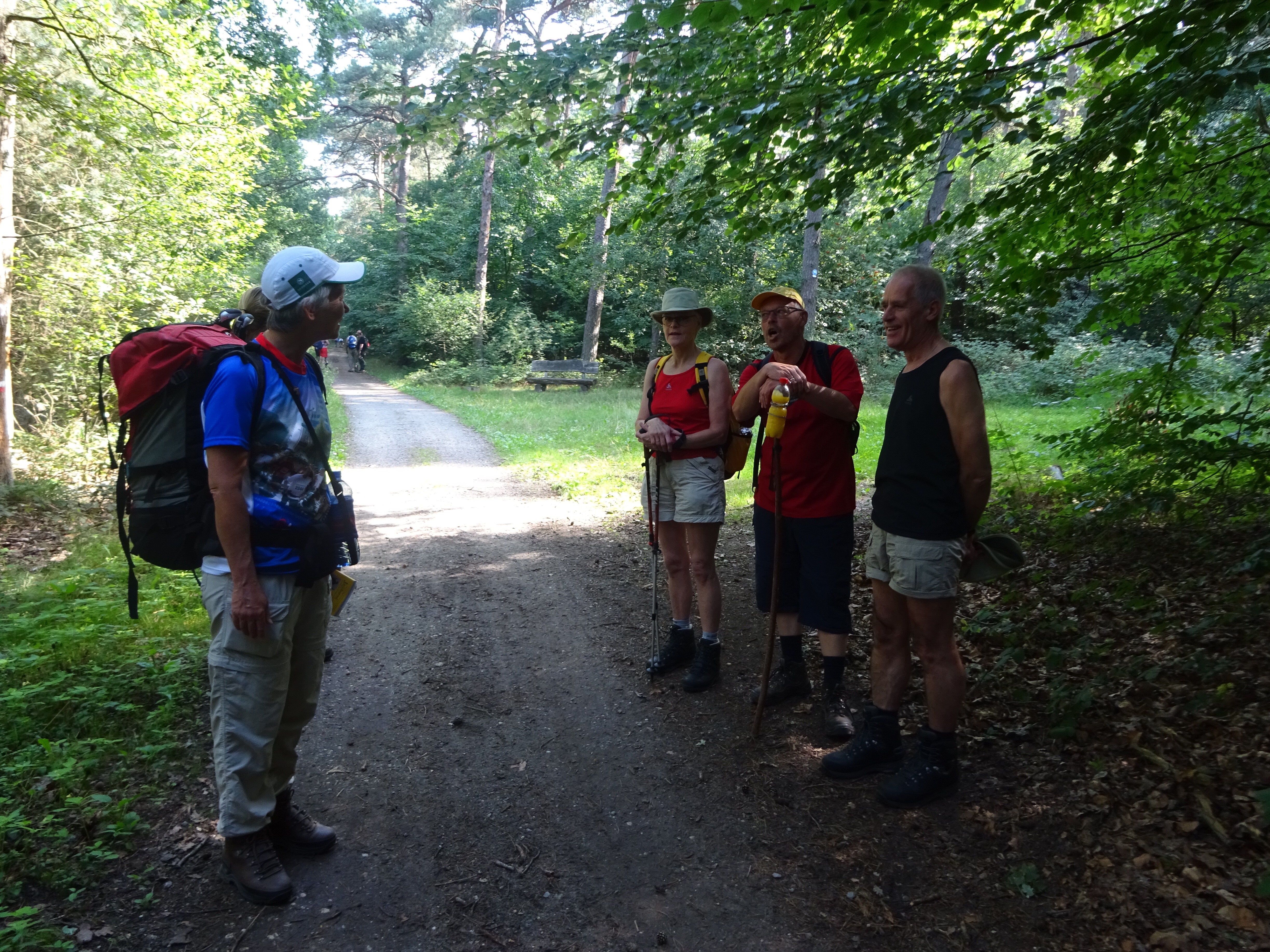 Nadat we Steyl verlaten hebben lopen we langs het kapelletje van Geloo en langs Belfeld. Daarna bereiken we het Brachterwald. We volgen urenlang de bosrand. Dat is een prima plek met de zomerse temperatuur van vandaag, en de volle zon. We lopen heerlijk in de schaduw. Het is zondag, en er wordt hier volop gewandeld, gefietst en hardgelopen. Ergens op dit traject komen we een grote groep wandelaars tegen, waarvan er een de gids, die Maarte in de hand heeft, herkent. Hij, en nog twee anderen uit deze groep, zijn ook naar Santiago gelopen. En zoals met alle Santiago-gangers, die we eerder ontmoetten, ontstaat er meteen een geanimeerd gesprek. Misschien komen we deze man in de buurt van Vezelay weer tegen, want hij gaat daar in september vrijwilligerswerk in een refugio doen (l’esprit du chemin).