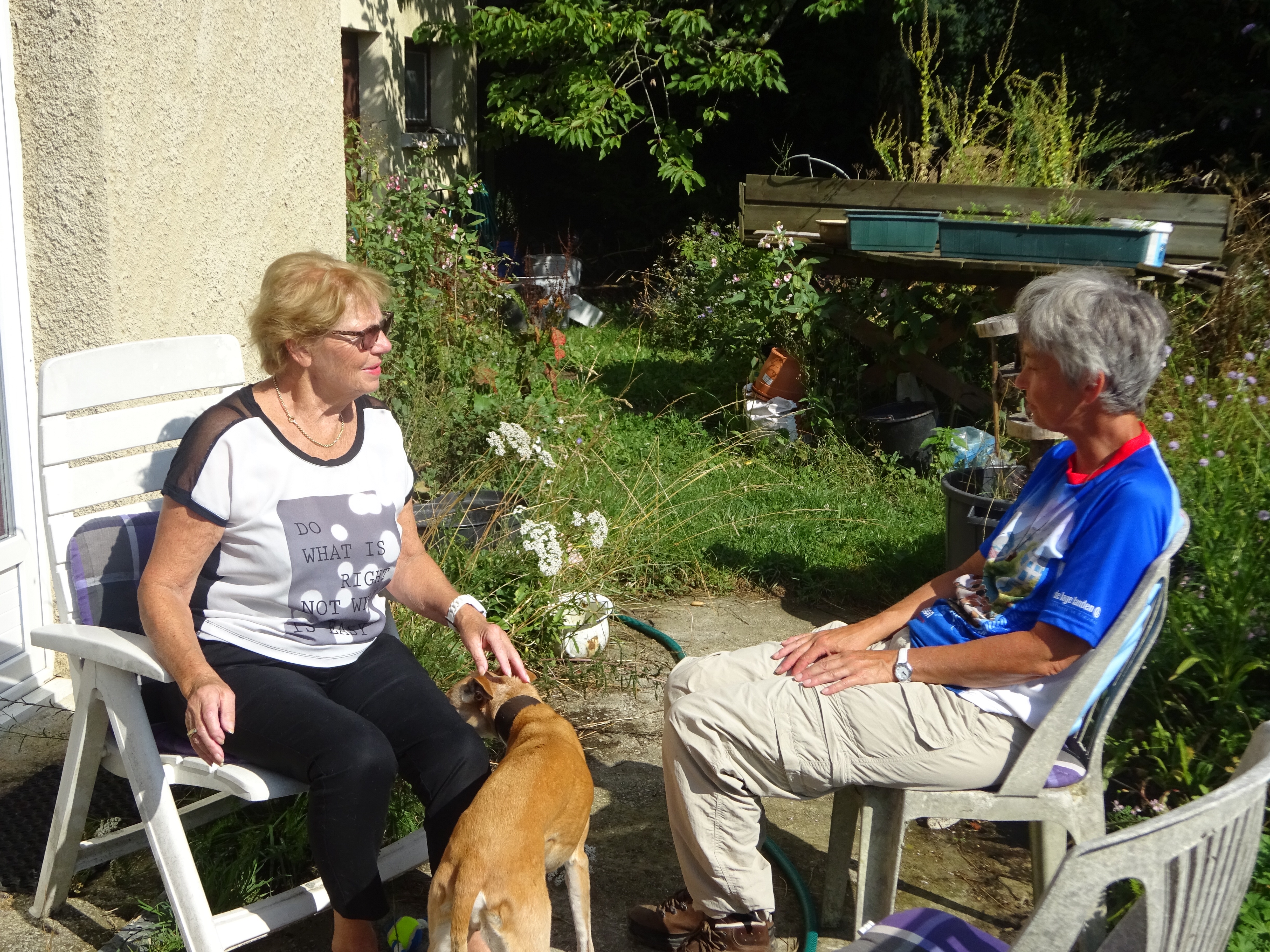 Hierna gaat de weg verder over zandpaden, door bos en door velden. Als we weer bij een huis uitkomen komt daar net een vrouw thuis. Ze hoort ons Nederlands praten. Het blijkt een Nederlandse te zijn, die bij Clermont Ferrand woont. Ze heet Atie en past hier een week op een huis. We worden meteen uitgenodigd voor de koffie. Het is zo gezellig dat we eigenlijk te lang blijven zitten.