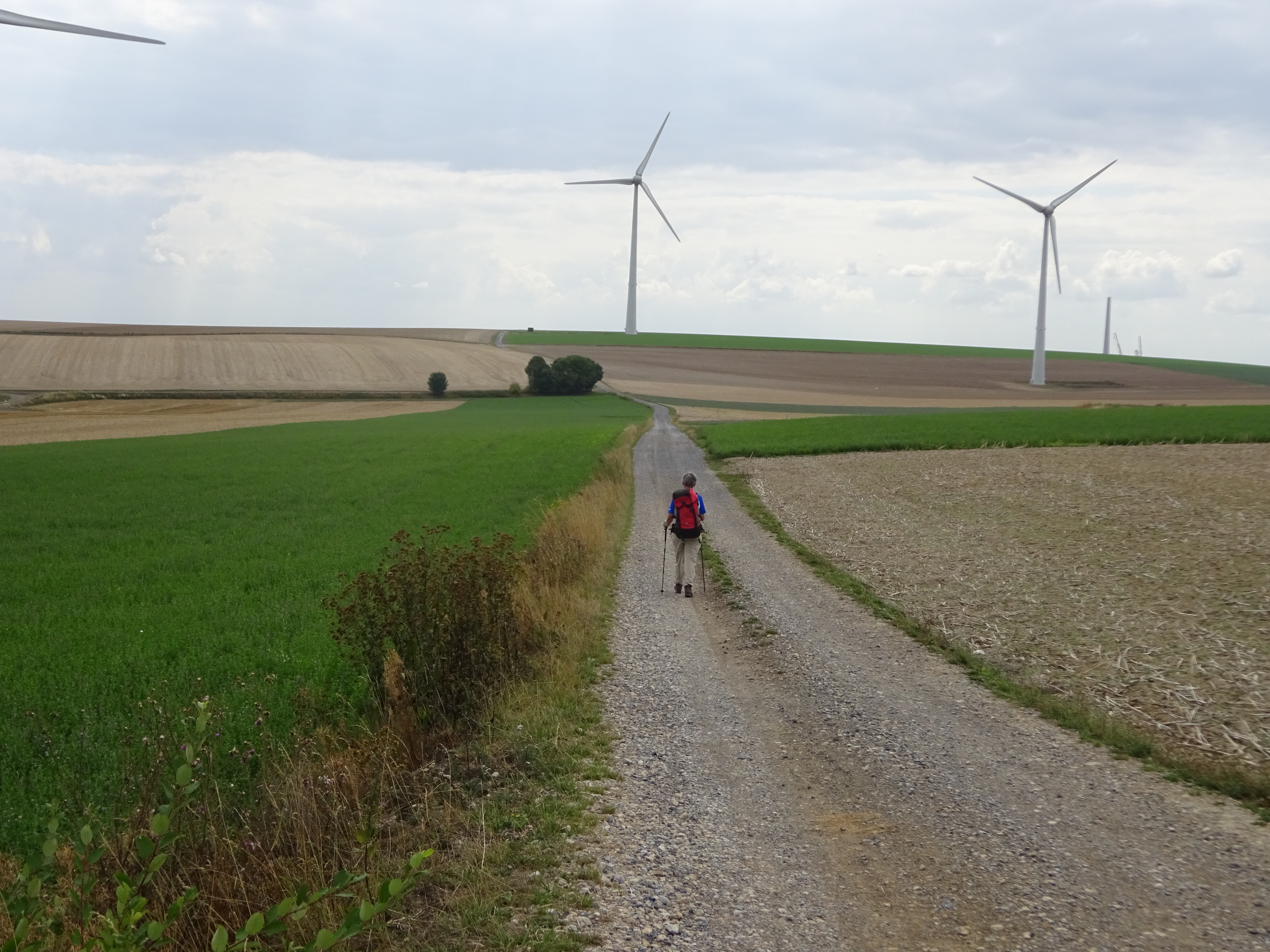‘s Middags schieten we beter op. We lopen lange rechte stukken tussen, intussen gemaaide, graanvelden. Zover je kijkt, geen dorpen, alleen maar uitgestrekte velden. In dit gebied zijn er veel windmolens gebouwd. We zien verschillende groepjes, alle kanten op. Uiteindelijk lopen we er langs.