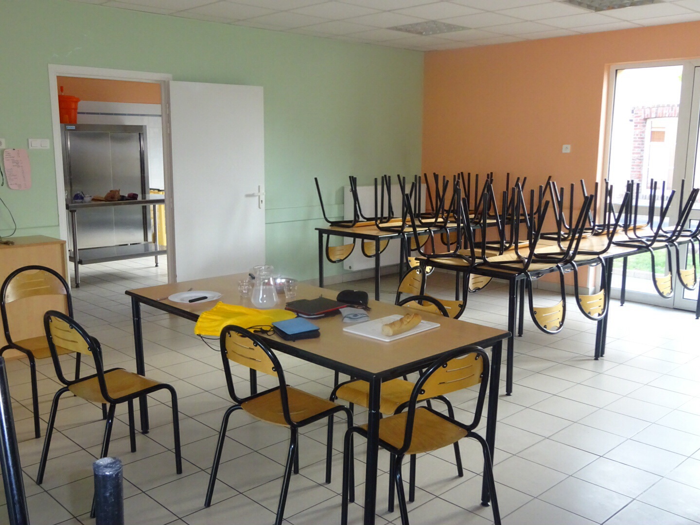 We hebben het gemeentehuis nog niet gevonden, als we geroepen worden door een vrouw. Zij is van de gemeente, en aan het werk in de gîte. Deze gîte is gevestigd in een school. We krijgen de hele school tot onze beschikking. Er is een douche en toiletten, een professionele keuken met grote ovens (kinderen eten hier tussen de middag op school), een eetzaal met 50 stoelen. We hebben de ruimte vandaag! We slapen op speelkussens/gymnastiekmatten op de grond.
