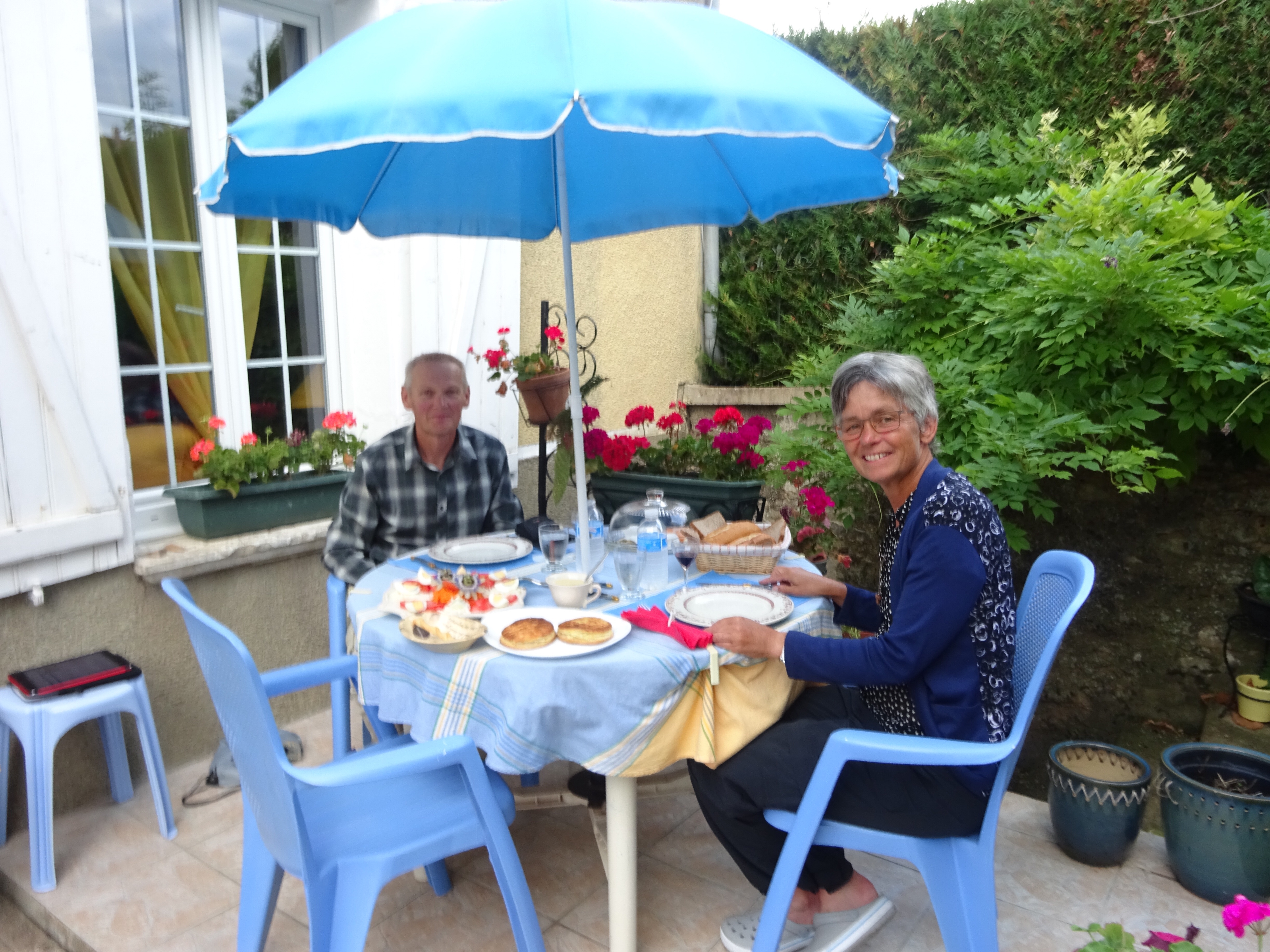 In Ervy-Châtel is er vandaag de wekelijkse markt. We komen er om elf uur aan. Voor ons is het intussen wel tijd voor lunch. Maar het restaurant vindt dat het nog te vroeg is om iets te eten te verkopen. Maar hiernaast is een bakkerij, zeggen ze. “Is het goed dat we daar iets halen, en het hier opeten?” “Ja, natuurlijk” is het antwoord. Dus we bestellen een cola, en halen wat broodjes. Tegen de tijd dat we die op hebben, loopt Nico de zaak binnen. Marjorie zit buiten. Zij hebben gisteren in Eaux-Puiseaux overnacht. Leuk om elkaar weer tegen te komen!