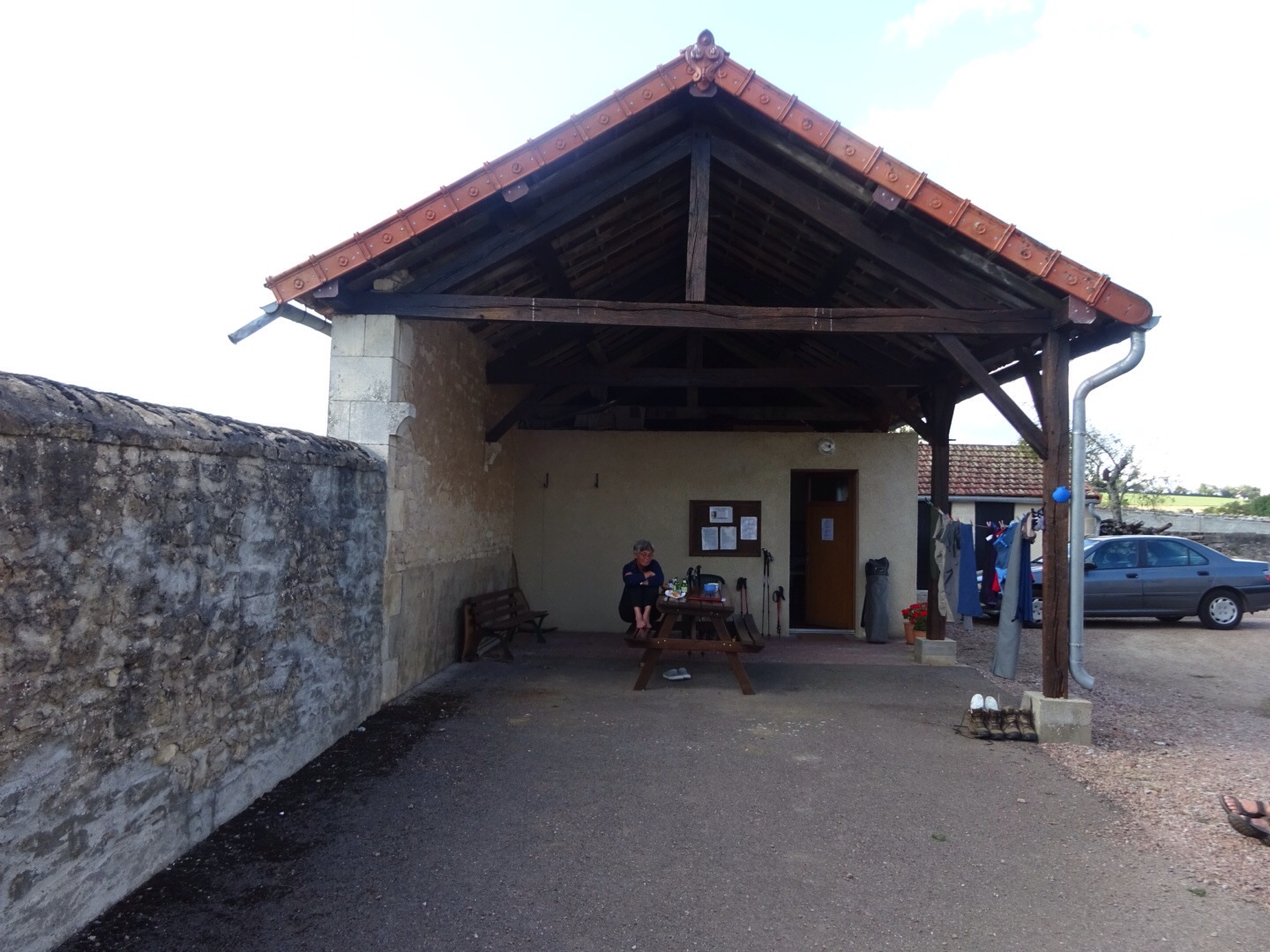 Er is een bar. Dus mooie gelegenheid om even te zitten. Als we een broodje bestellen, zien we het zoontje naar de buren (bakker) hollen. En even later komt hij terug met een baguette. Dat wordt ons broodje dus!
