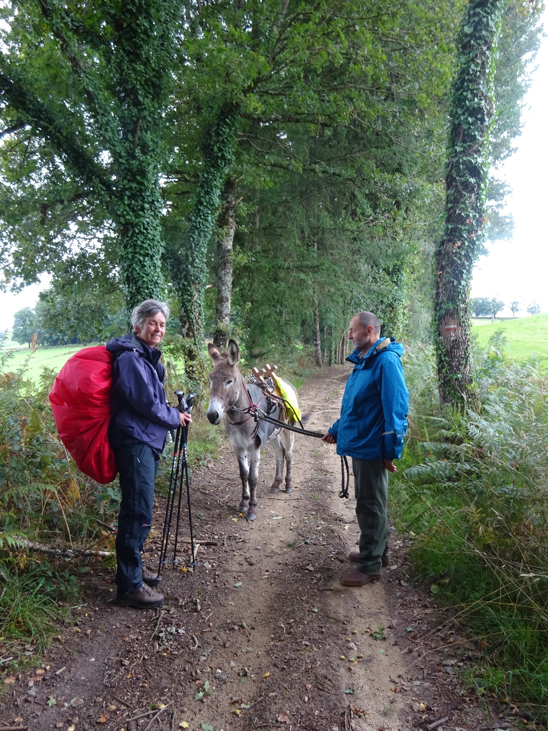 Als we aan de andere kant van de rivier weer door het bos omhoog lopen, is daar opeens een man met een ezel voor ons. “Ook onderweg naar Santiago?” vragen we hem. Het antwoord is ontkennend. En hij probeert een paar keer uit te leggen, waarom hij hier dan wel met een ezel en een heleboel tassen en rugzakken is; maar het lukt ons niet om zijn verhaal te begrijpen.