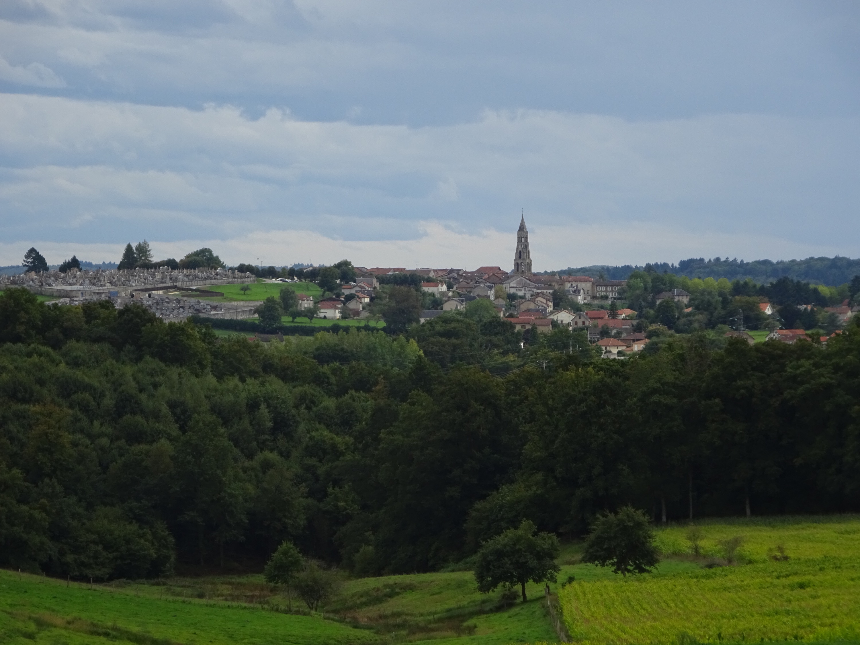 Onze tweede rust is op een bankje bij de kerk van La Châtenet-en-Dognon. We gunnen ons er niet heel veel tijd, want het is al laat. Verder heuvel op en heuvel af. Wat is het hier overal groen. Het regent hier vast wel vaker. Uiteindelijk zien we in de verte St. Léonard-de-Noblat liggen.