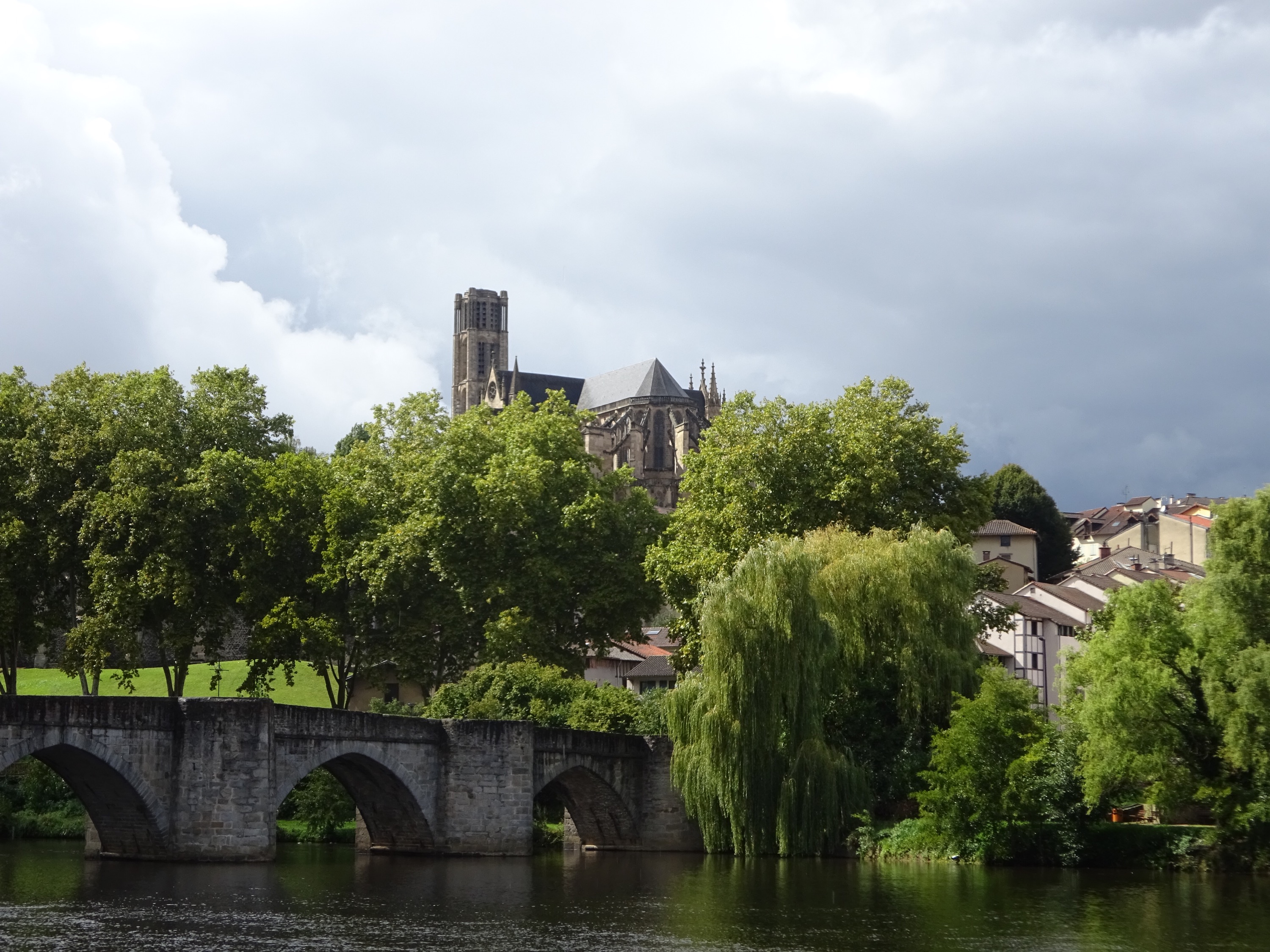 Een paar kilometer via een heel drukke weg, gevolgd door een mooie wandeling langs het riviertje de Vienne als we Limoges binnenlopen. We zien de kathedraal van de stad al liggen.
