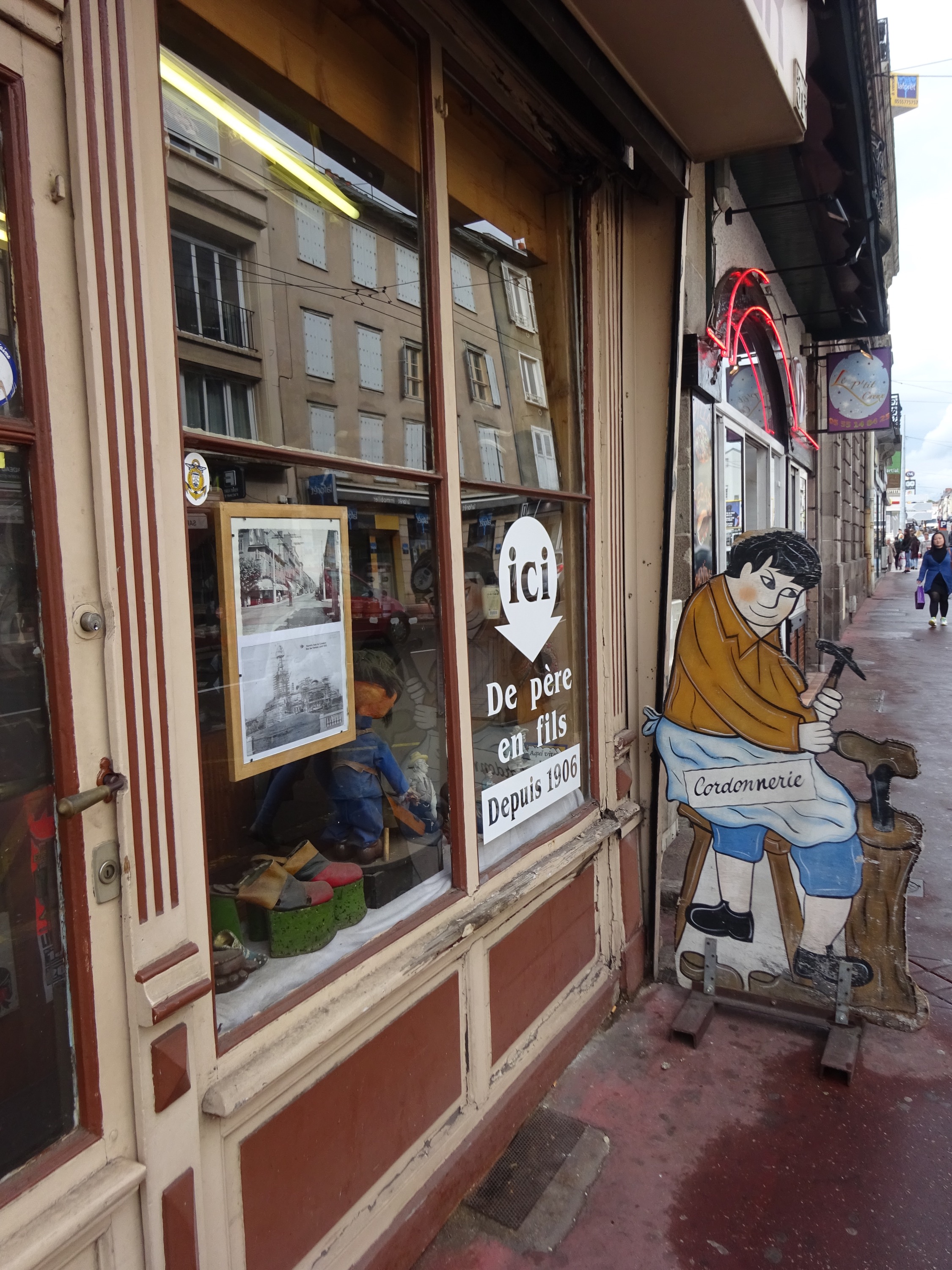 De eerste actie na aankomst is de schoenmaker vinden. Maarte heeft nieuwe hakken voor zijn wandelschoenen nodig. Hij heeft voor deze reis nieuwe categorie-A bergschoenen gekocht. Ze hebben veel zachtere zolen dan mijn oude categorie-B schoenen. Via een foto op de blog van een andere Santiago-loper en de VVV vinden we de winkel, of beter gezegd de werkplaats, aan de Avenue Garibaldi. Morgen kunnen we de schoenen weer ophalen.
