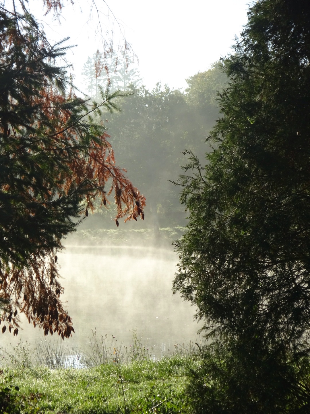 Het is al half negen als we vertrekken. Beetje laat voor een lange etappe. Maar we zaten nog lang aan de ontbijttafel. André en Marga hebben besloten vandaag niet te lopen om André’s rug wat te sparen.Er hangt grondmist als we buitenkomen. En de zon probeert die te verdrijven, Het ziet er prachtig uit.