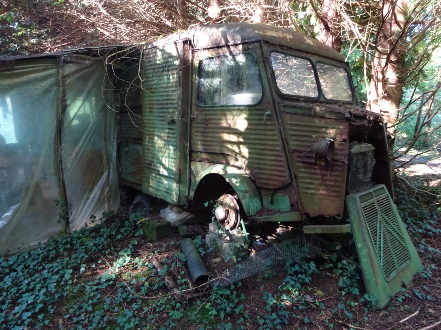 Ergens in het bos zien ee een oude auto, met aanbouw en kachelpijp. Het lijkt wel of daar iemand in woont.