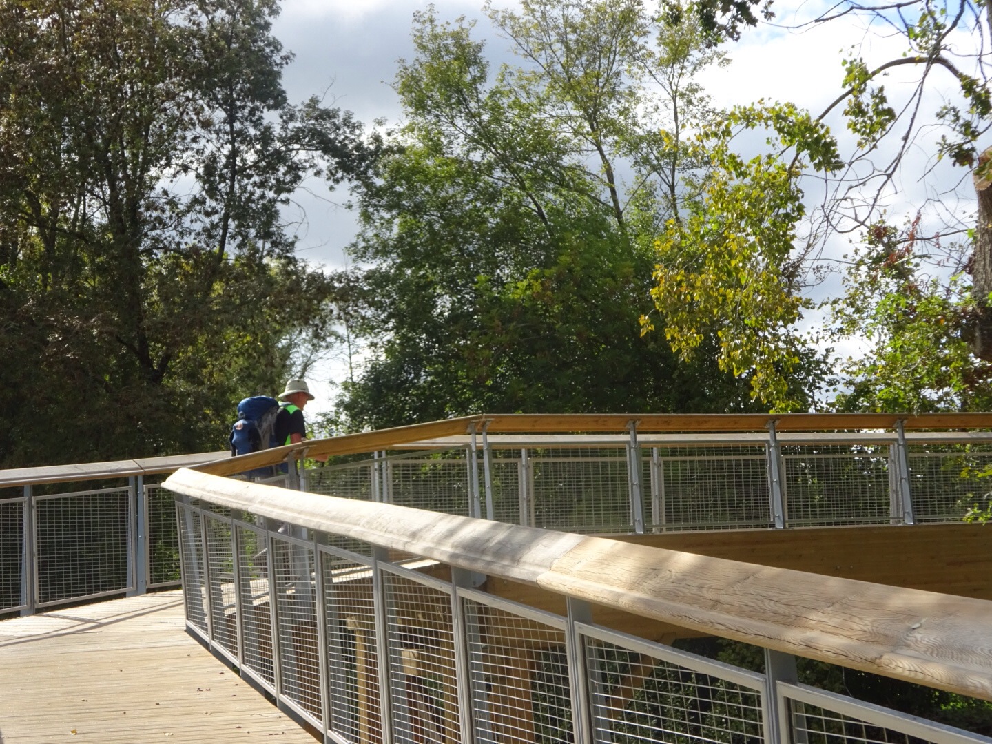 De laatste zes kilometer loopt onze route weer heel anders dan in het boekje aangegeven. We lopen weer over het nieuwe pad langs de Isle. Net als gisteren komen we weer over een mooie nieuwe wandel/fietsbrug.