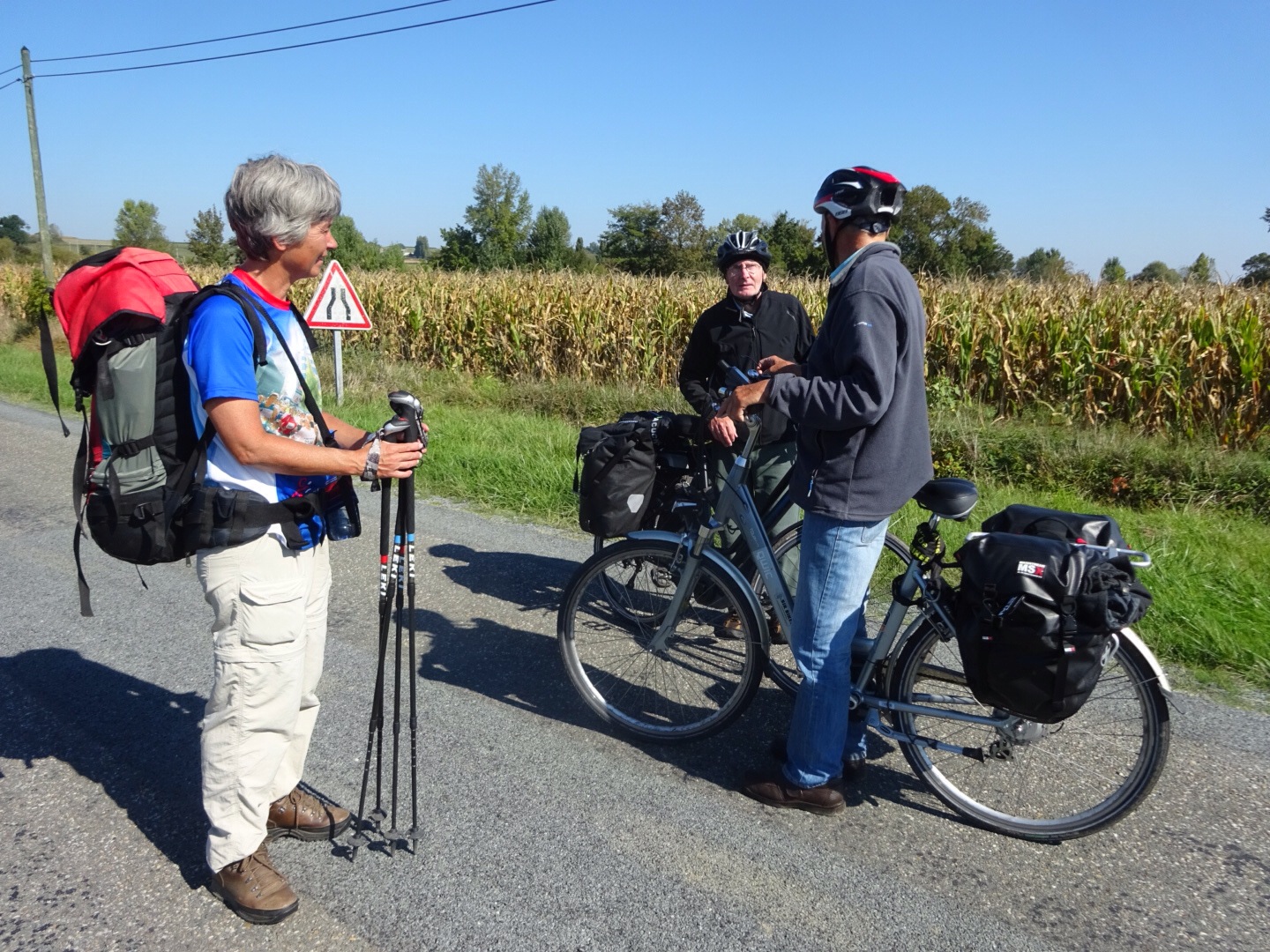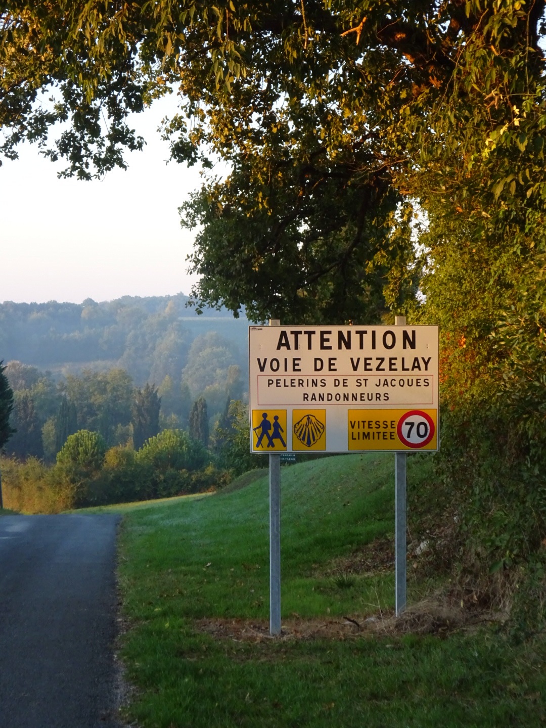 We voelen ons helemaal veilig op de weg vandaag. Een groot bord, direct buiten Pellegrue, waarschuwt automobilisten voor loslopende pelgrims…