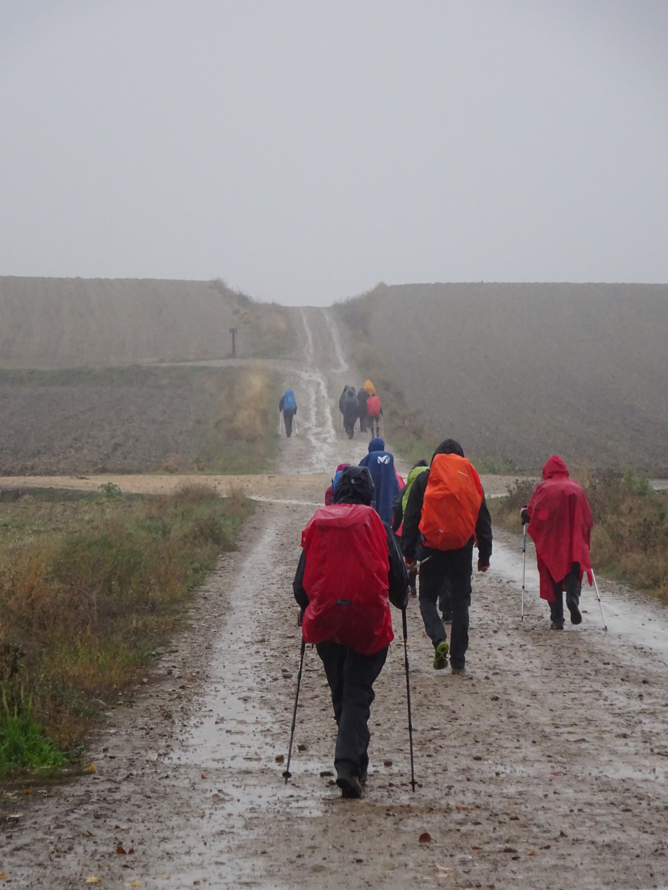 Op de betere momenten lopen we vijf minuten zonder capuchon. Het zicht is wat beter dan gisteren, maar ver weg kijken is er niet bij. De route loopt vandaag met een autoweg mee; veelal over een brede zandweg, direct naast de weg. Soms buigen we even af, om door een dorpje te lopen.