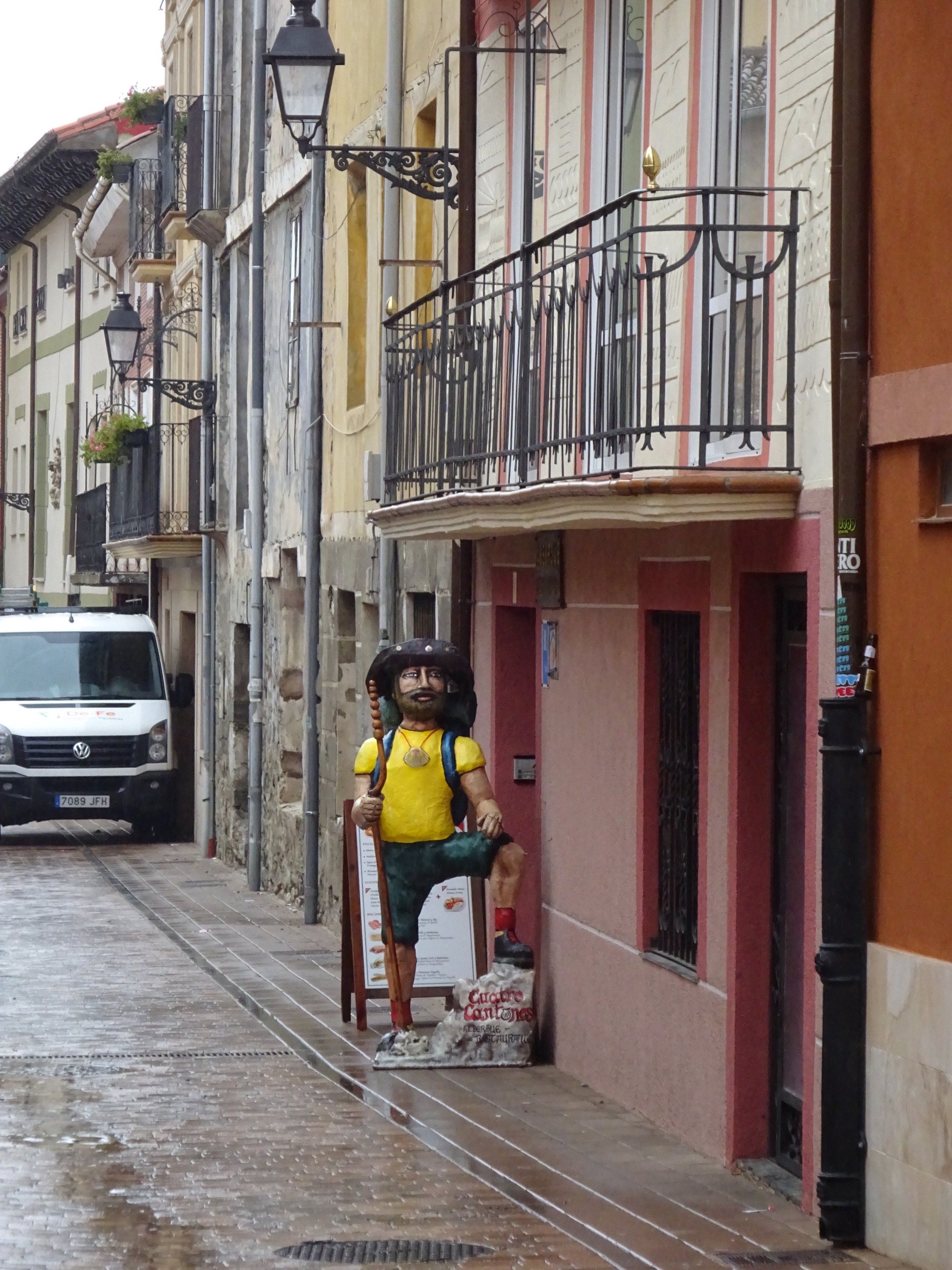 Na een paar uur is er een klein winkeltje met wat stoelen, waar we even schuilen. Het zit er vol met natte pelgrims. En ook rond de middag vinden we weer even een droge rustplek in een herberg.