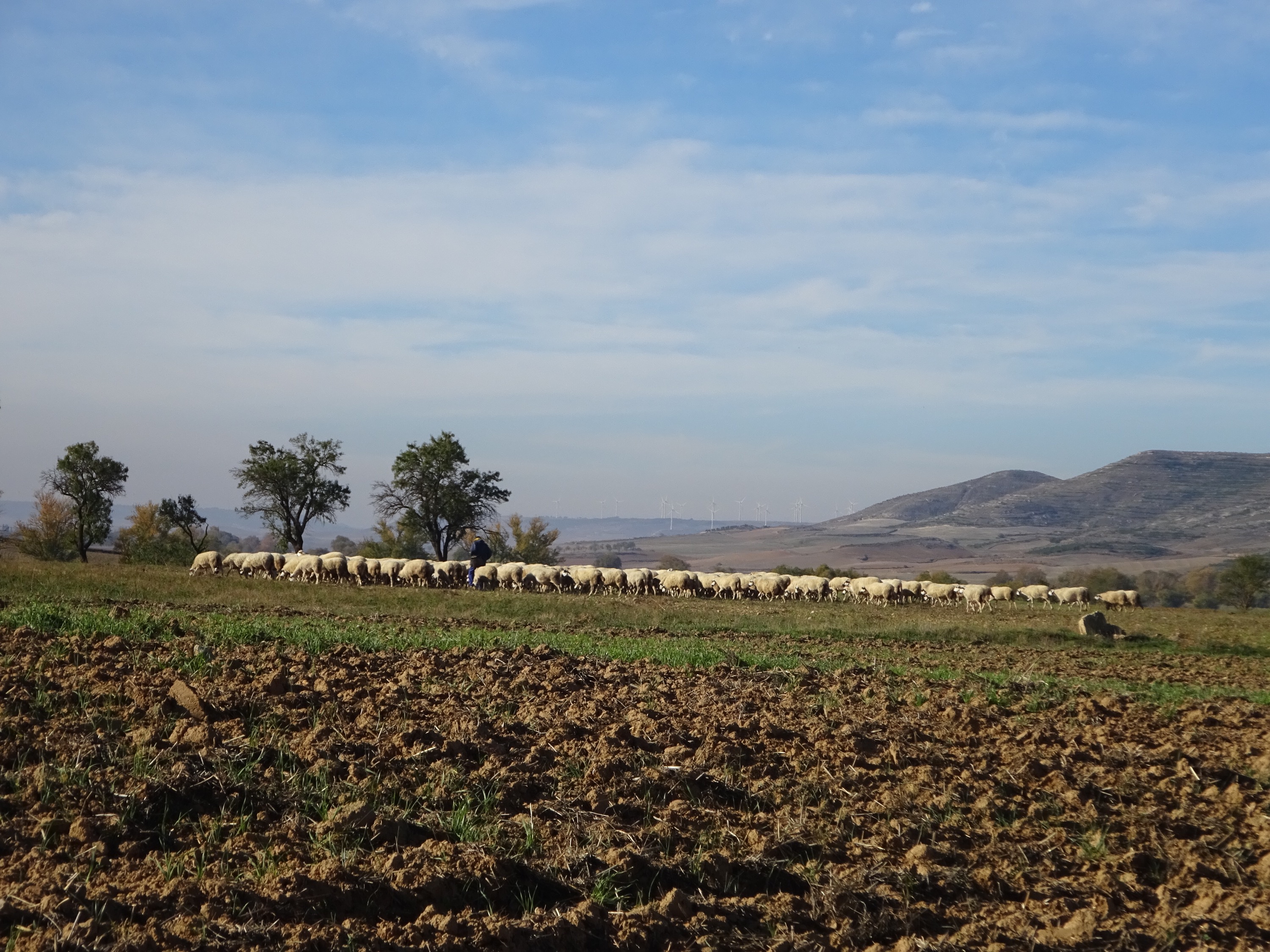 Voordat we weer omhoog gaan naar de Meseta komen we een herder met een kudde schapen tegen.