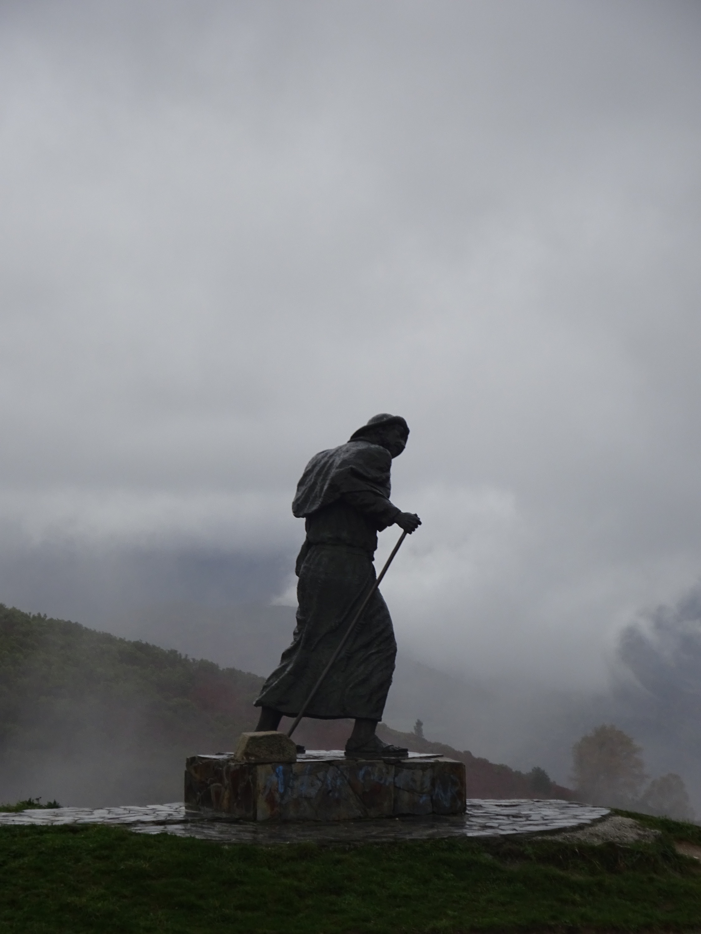 Het is mistig en het regent. Typisch Galicisch weer, zullen we maar zeggen.  Op de pas van San Roque staat een heel toepasselijk beeld van een pelgrim, die vecht tegen de elementen.