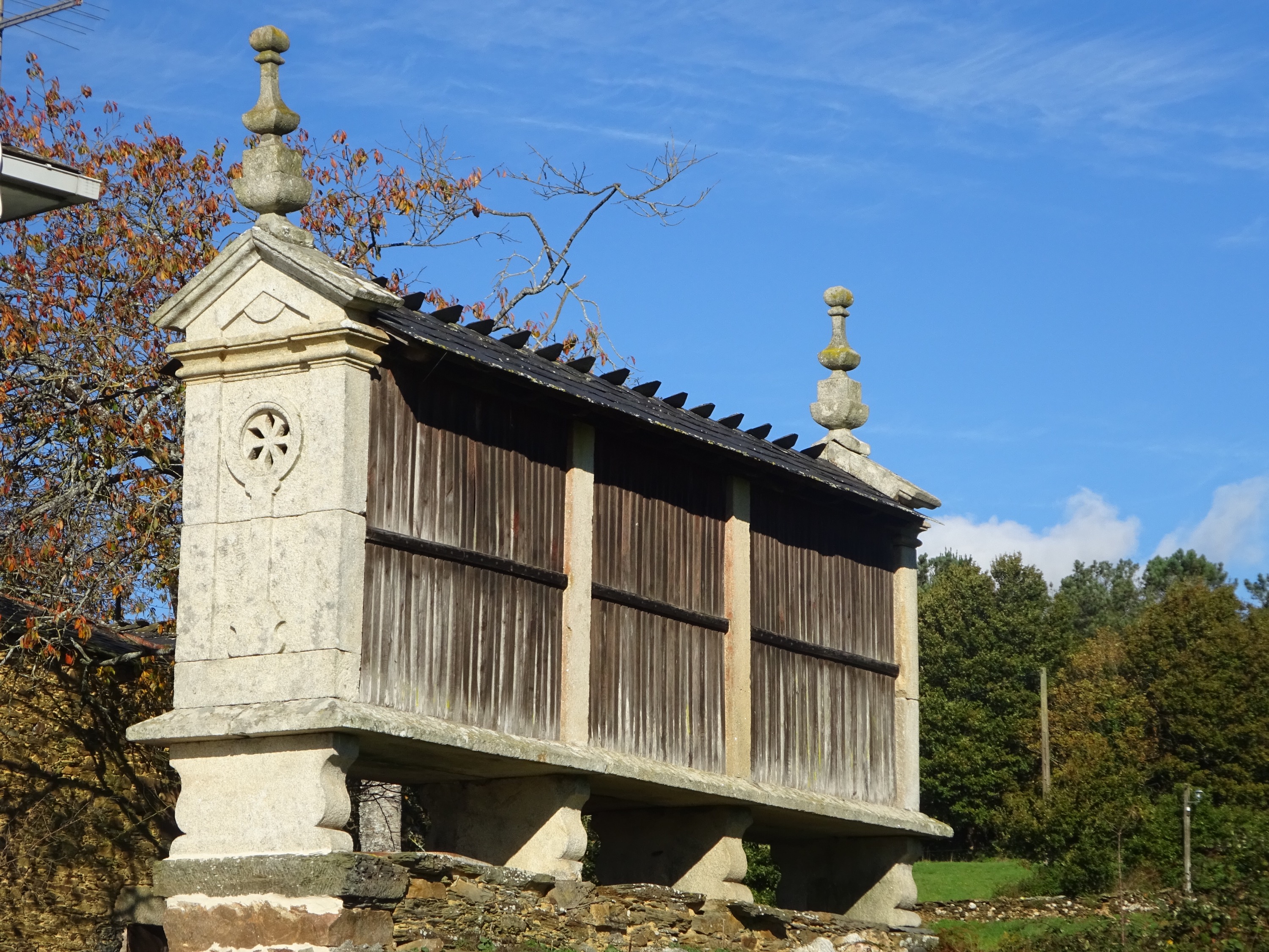 Net als gisteren zien we, bij bijna alle boerderijen, hoge smalle gebouwtjes. Intussen weet ik ook wat dit zijn. Het zijn een zogenaamde hórreo’s. Ze werden vroeger gebruikt voor graanopslag. Ze staan op poten, hoog boven de grond, om muizen te weren.