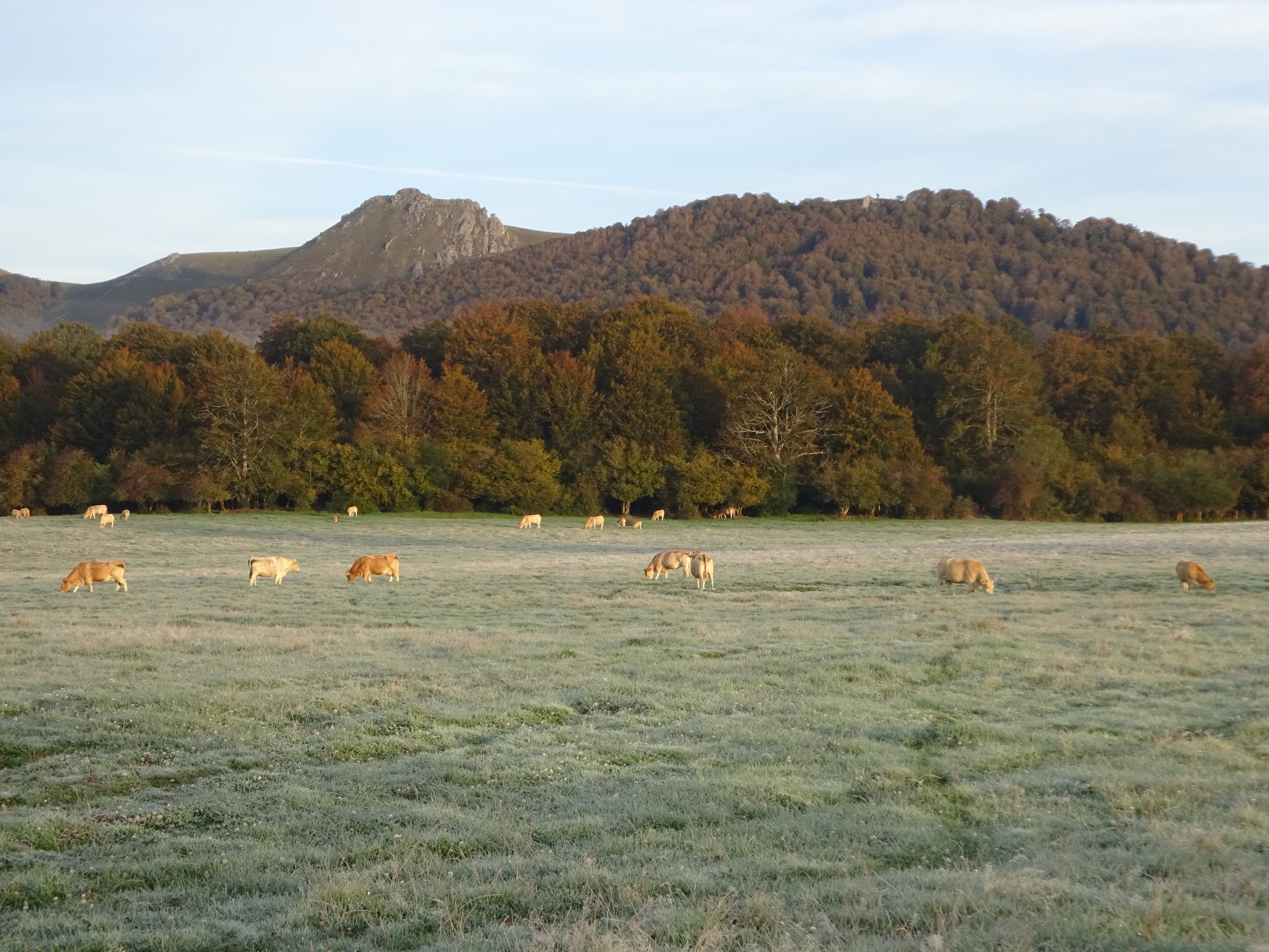 Roncesvalles ligt op 900m. Het is er vanochtend helder en koud. We lopen de eerste uren met jas en handschoenen. Het gras is wit bevroren.
